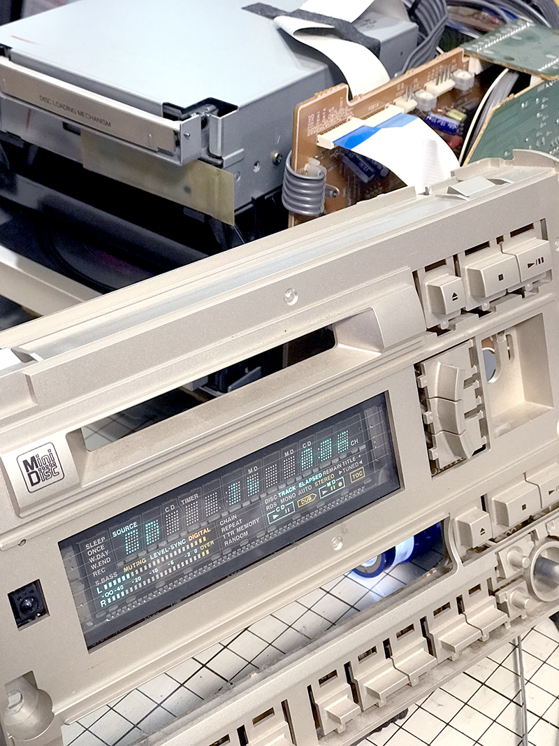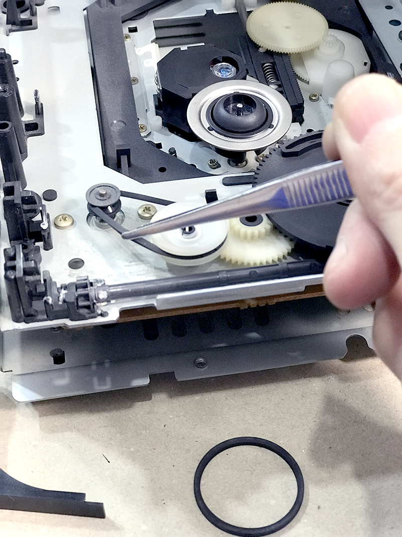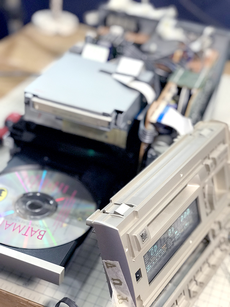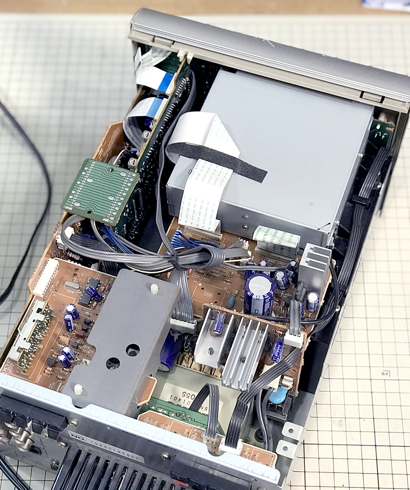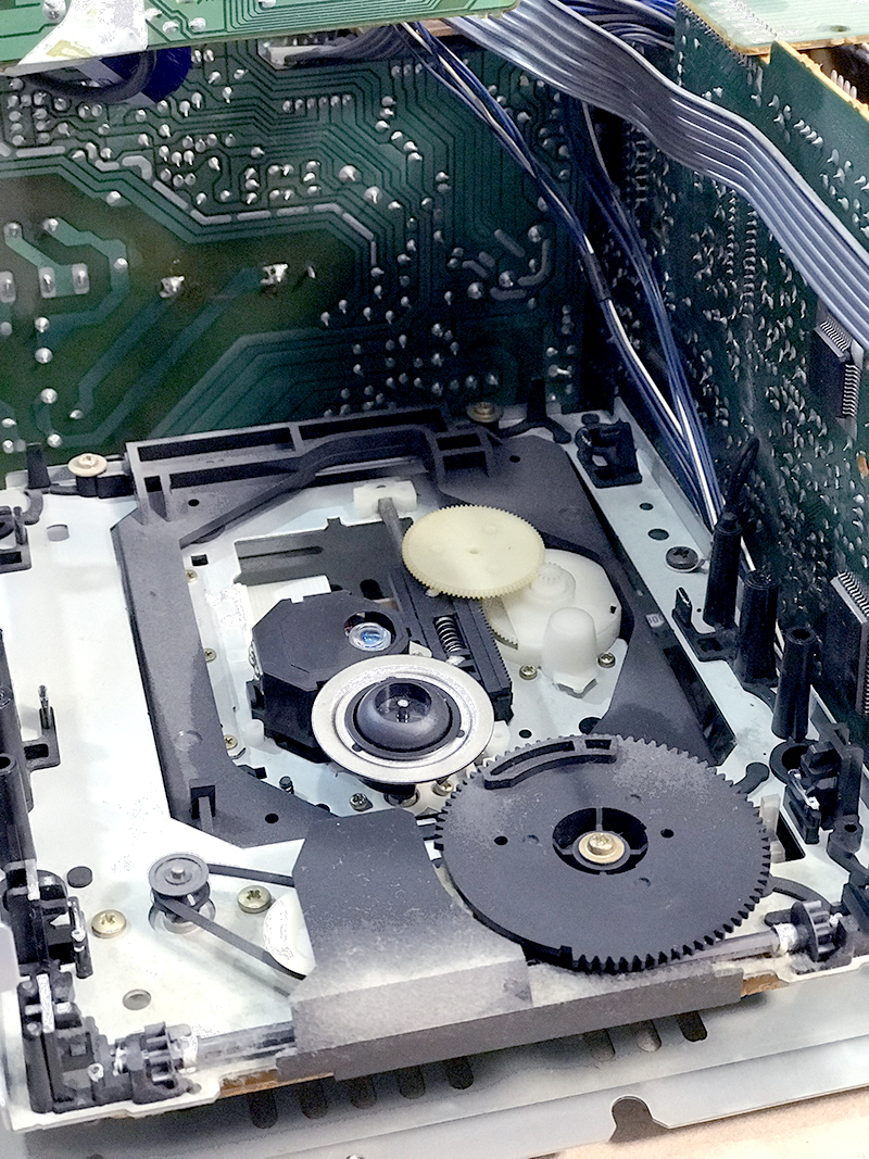 1999年モデルのミニコンポ。いつの頃からかCDトレーが開かなくなりました。蓋を開けて中を確認するとメカなセットがかっこいいので無駄に撮影。劣化していたゴムベルトを交換して修理完了しました。