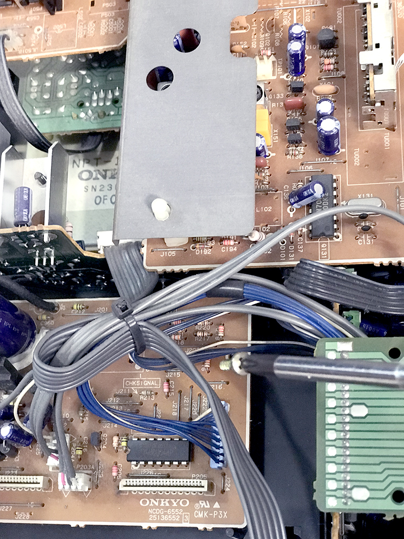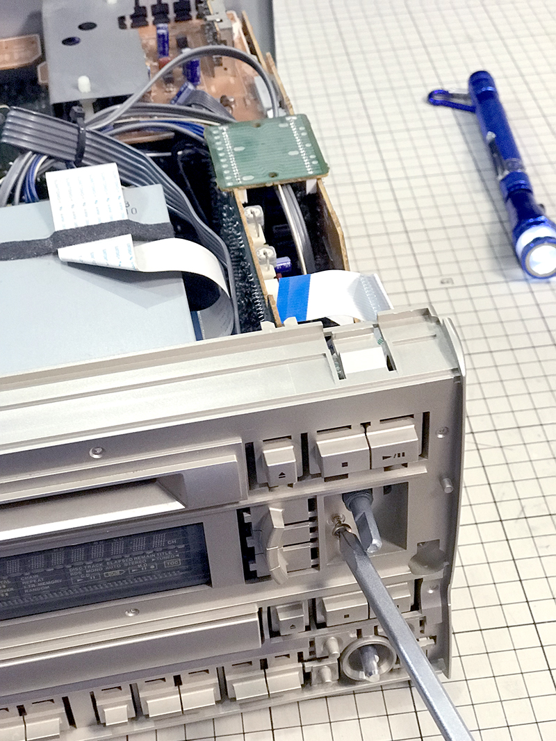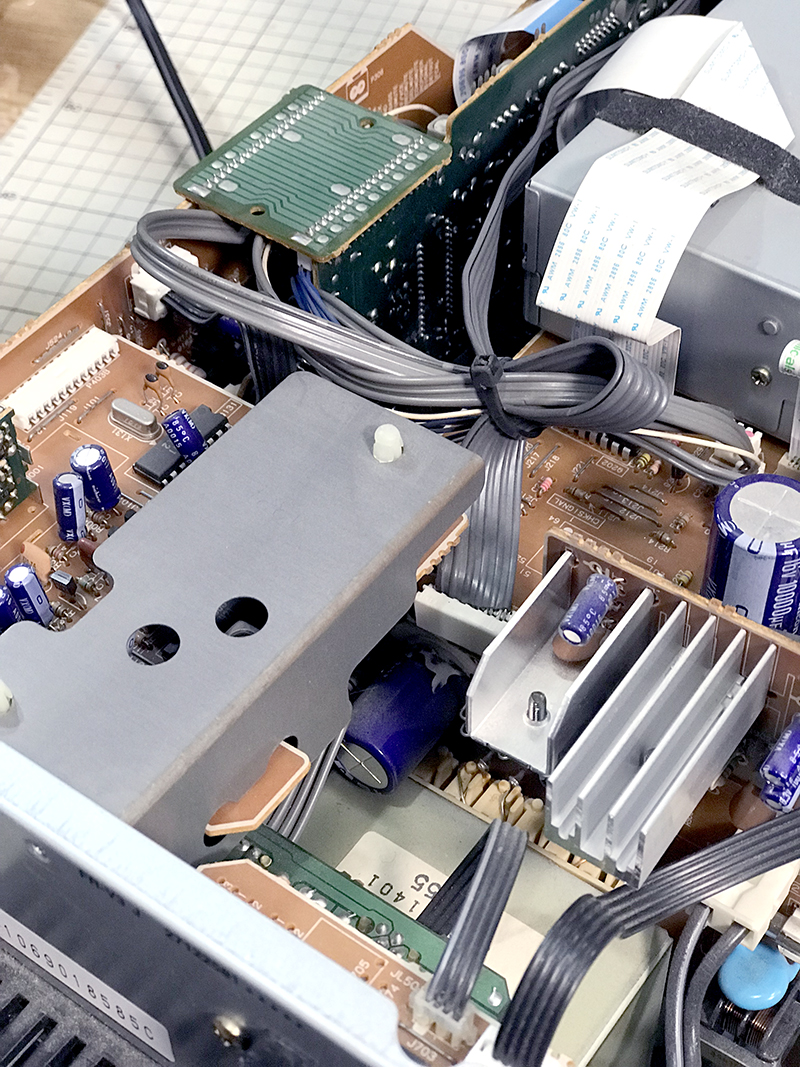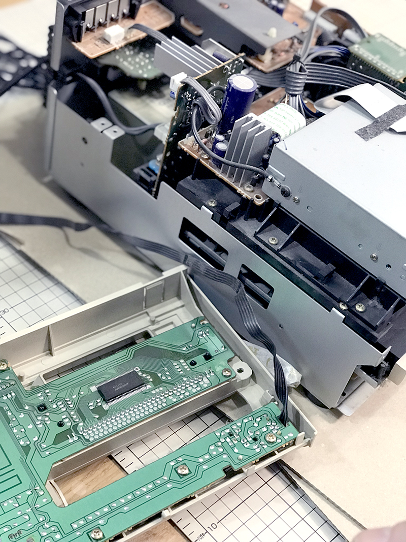 1999年モデルのミニコンポ。いつの頃からかCDトレーが開かなくなりました。蓋を開けて中を確認するとメカなセットがかっこいいので無駄に撮影。劣化していたゴムベルトを交換して修理完了しました。